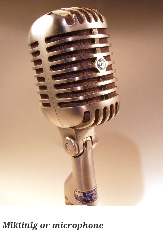 Definition: A type of instrument that is used in transmitting o recording sounds. Used in a sentence: Gumamit si Sarah Geronimo ng kulay gintong miktinig upang marinig ng lahat ang kanyang kakantahin. "